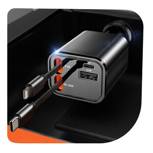 このシガーソケット充電器は、 ライトニング(12W)とType-C(30W)の2本の巻き取り式充電ケーブルと USB-Aポート(12W)*1、USB-Cポート(15W)*1の2つの急速充電ポートが付属し 4台のデバイスを同時に充...