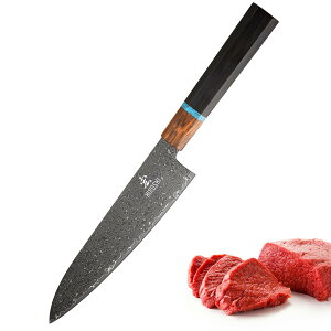 シェフナイフと呼ばれるように、両刃で肉以外にも様々な調理に使用できます。 ■材質 刃の材質:(刃芯)V金10号(側)軟硬ステンレス 全35層仕上げ。