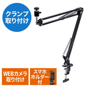 ウェブ会議でウェブカメラを、最適な角度や高さの位置に固定可能なクランプ式のアームスタンド。付属のスマホホルダーを使えばスマートフォンやiPhoneも設置可能。【ウェブカメラ用アームスタンド】のイーサプライの通信販売! サンワダイレクト...