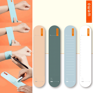 「いつでも/どこでも、書ける/思い出せる」をコンセプトにした、 腕に巻いて、何度書いても消せるメモ「ウェアラブルメモ」です。 ・素材にシリコンを採用し独自のコーティングを施すことで、油性ボールペンで書き、消しゴムや指で